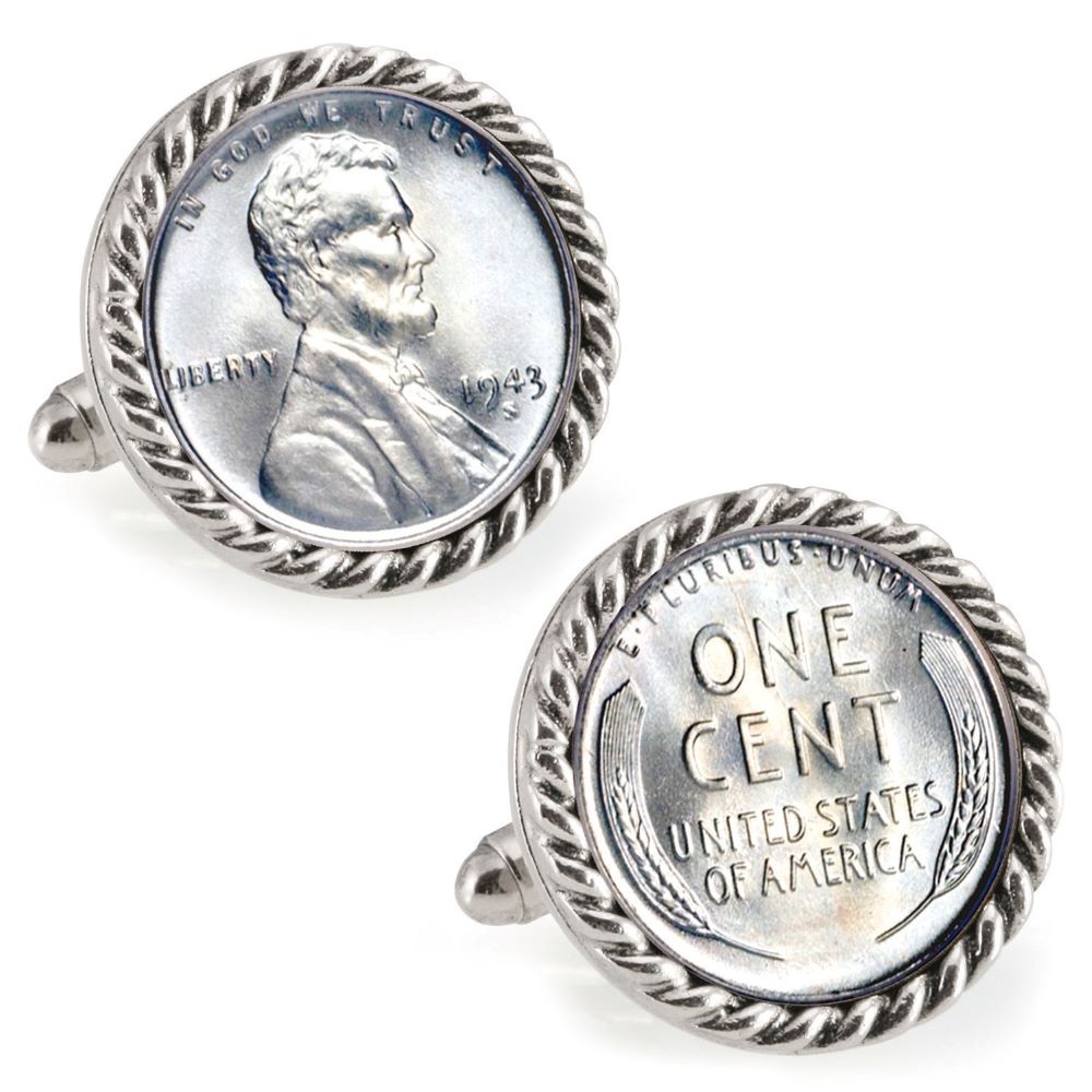 1943 Lincoln Steel Penny Silvertone Rope Bezel Coin Cuff Links