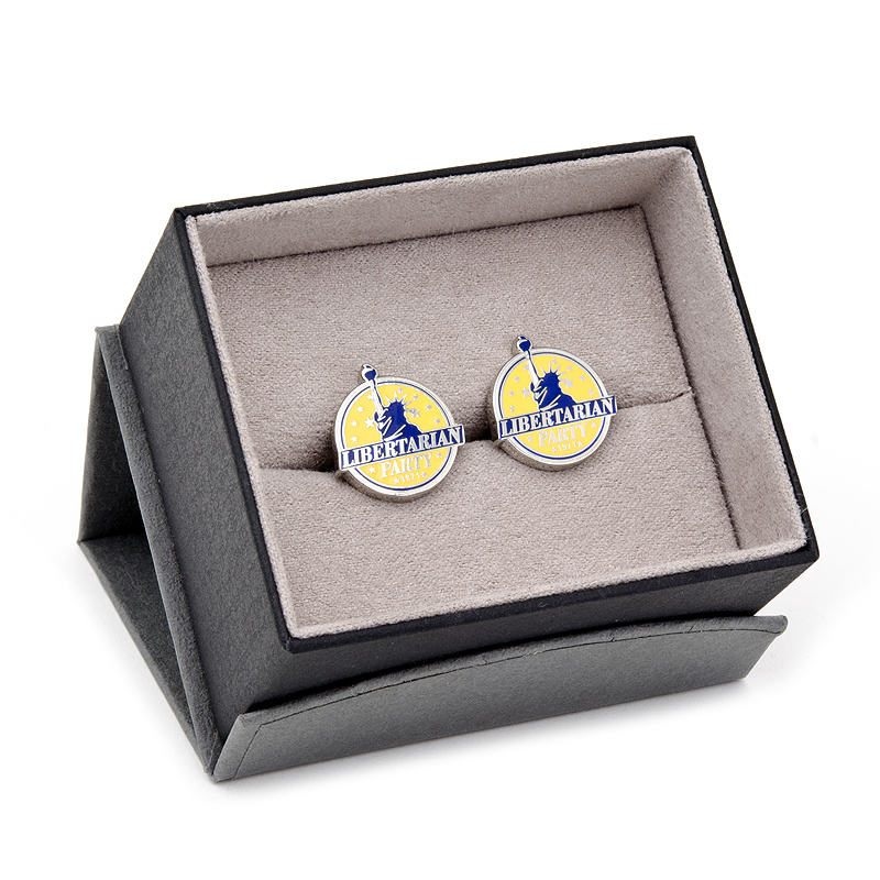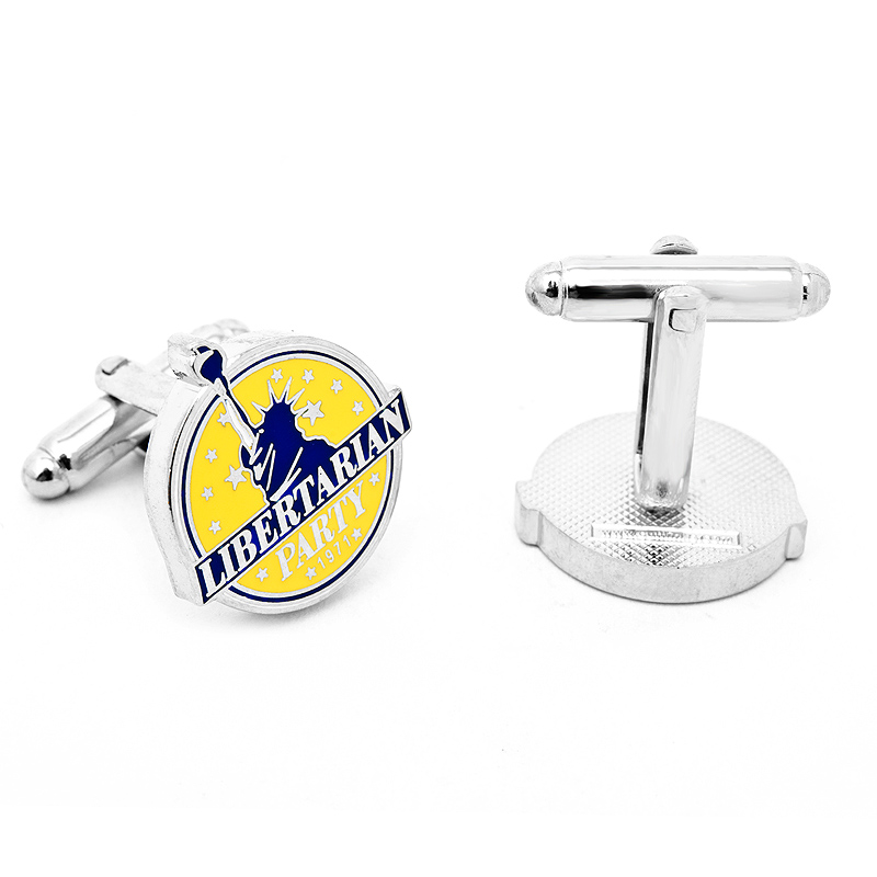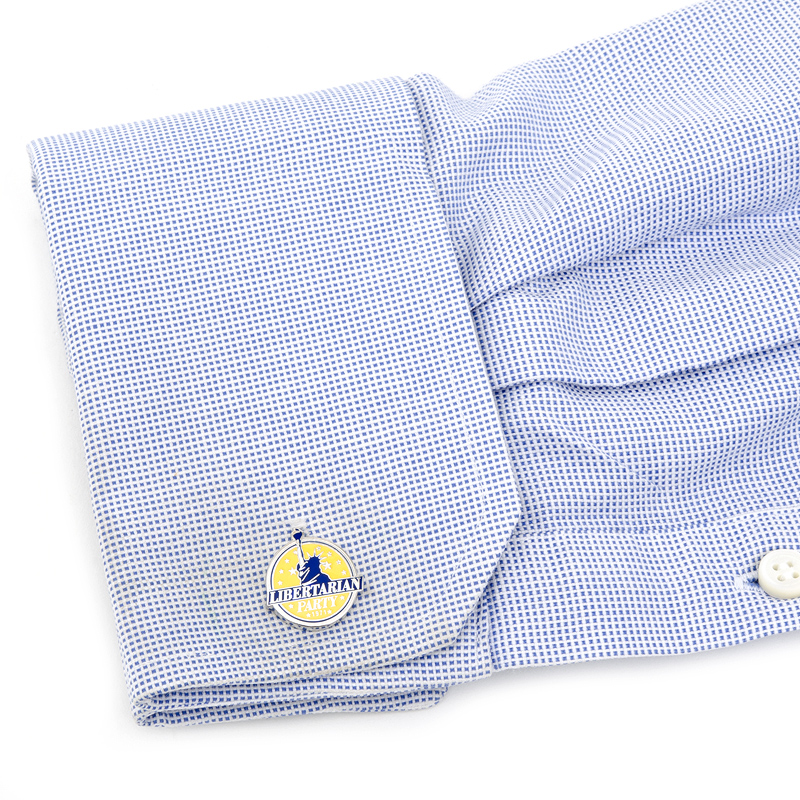 Founded in 1971, what was once a small group of political activists in Colorado quickly emerged into the 3rd largest political party in the US. Disillusioned with the current state of politics, Libertarians, past and present, work toward creating a free-market economy robust with civil liberties, personal freedoms, a foreign policy of non-intervention, peace and free trades as originally declared in the Declaration of Independence. Modeled from the actual 1971 Libertarian button and constructed from rhodium plated base metal and enamel, now you can cast your ballot in style with 1971 Libertarian Party Button Cufflinks. Cufflinks by Cufflinks, Inc.