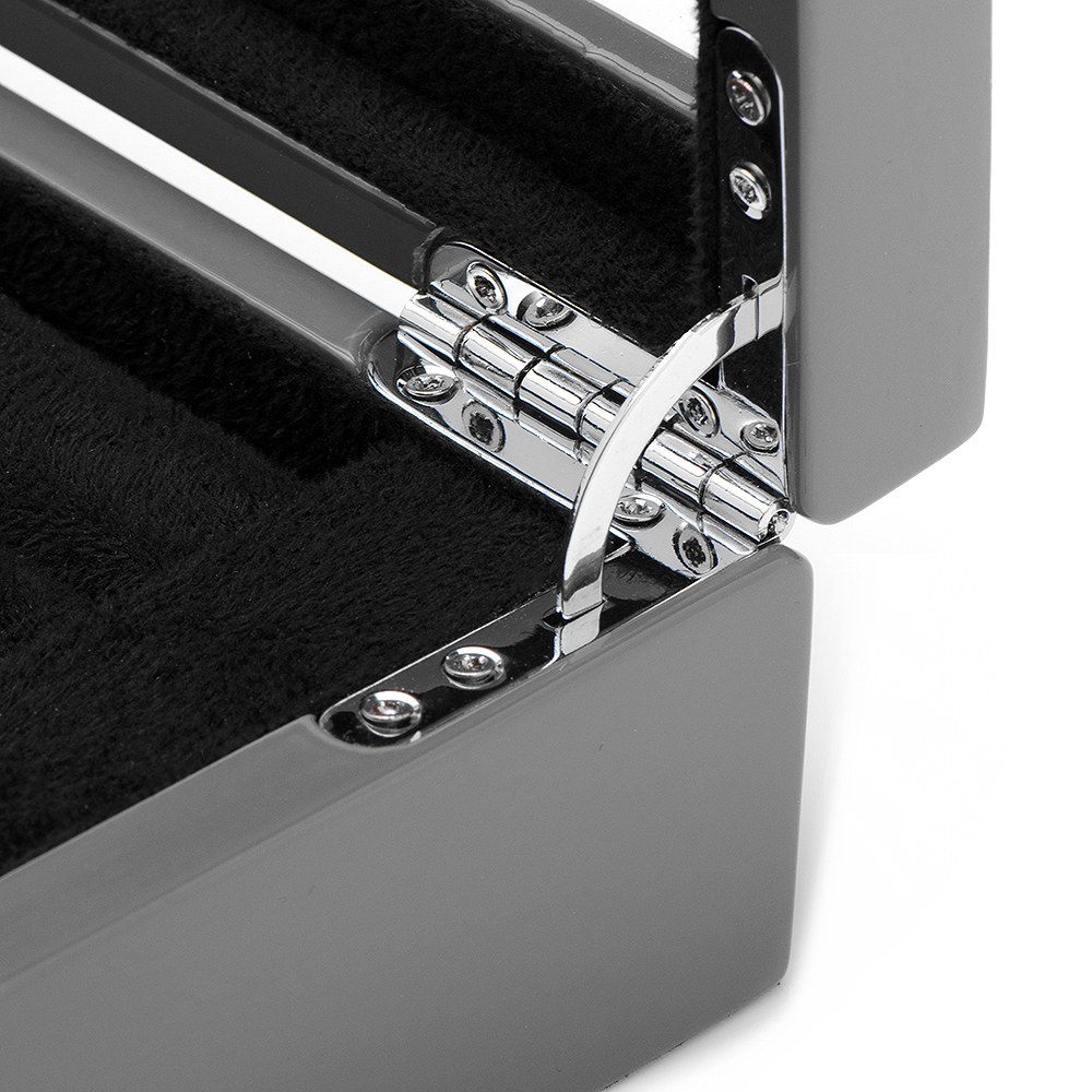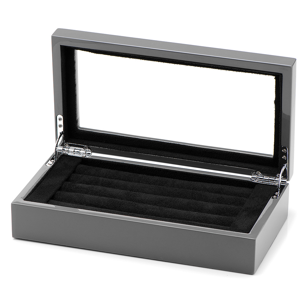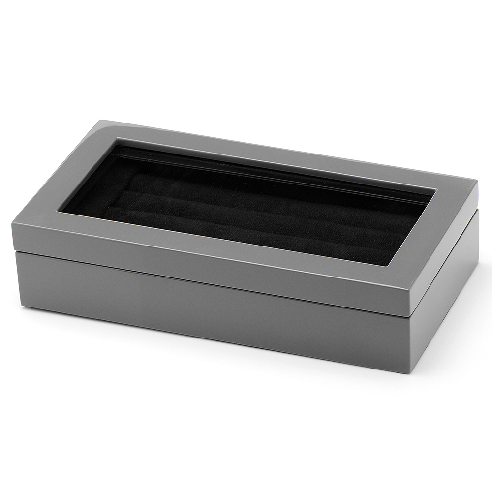 A true connoisseur of men's fashion understands the needs of cufflinks. Treat your links like the true works of art they are in the 20 Pair Grey Cufflinks Collector's Case by Ravi Ratan. An impeccable, classic design with a new modern twist. The storage case is constructed of solid oak with deep rich grey finish. Glass top for convenient viewing, durable metal hinges, and and 4 rows of microfiber suede lined cushions to hold up to 20 pairs of cufflinks (5 pair per row).Cufflinks case by Ravi Ratan.