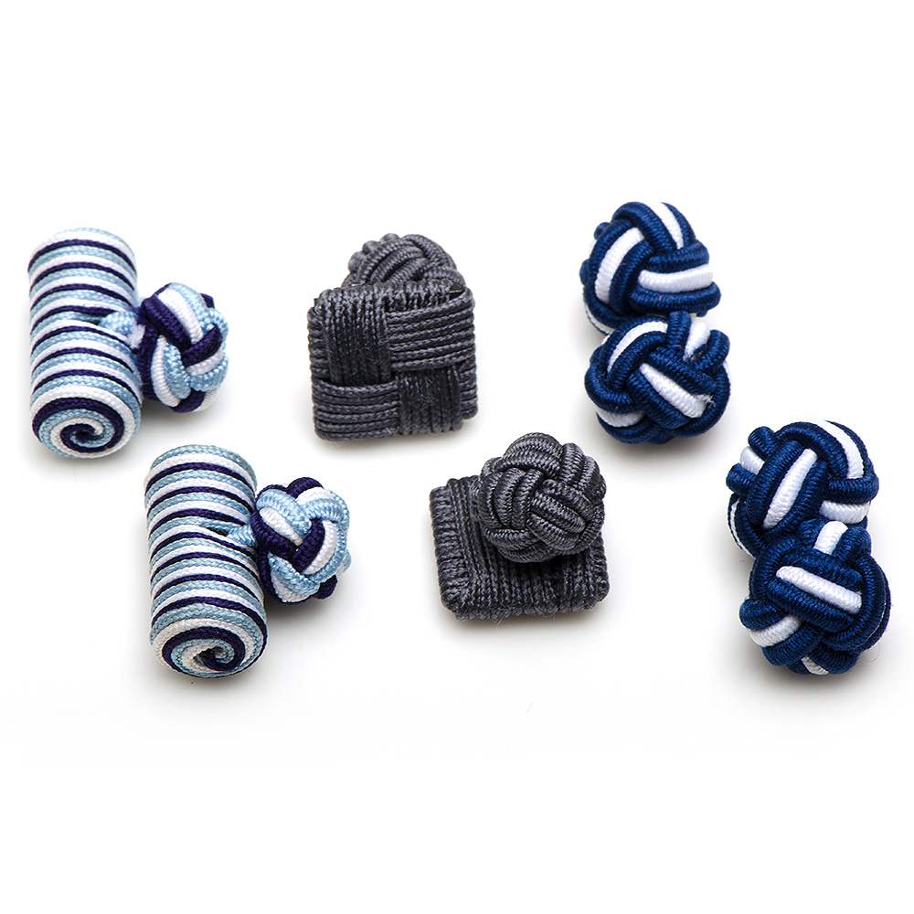 Approximately 3/4" by 3/8". Three pairs of assorted silk knots. Packaged in a corked glass vial.