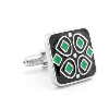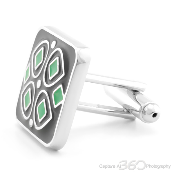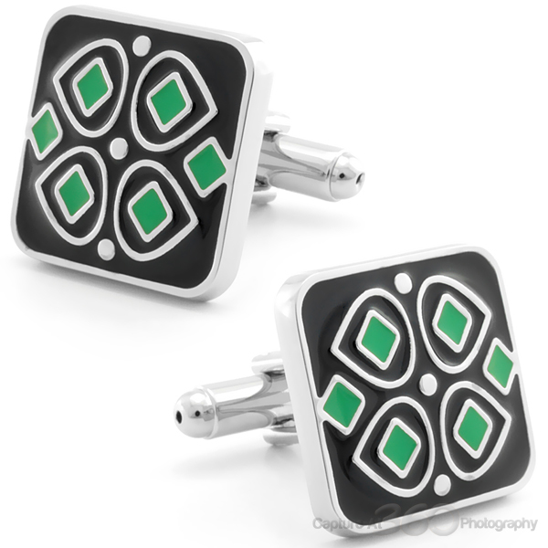 With a design straight from Morocco, no wonder these Artic Green Cufflinks are a must have item for fall. Featuring a black square with an intricate silver design, and accented with artic green, these silver plated cufflinks come complete with a bullet back closure.