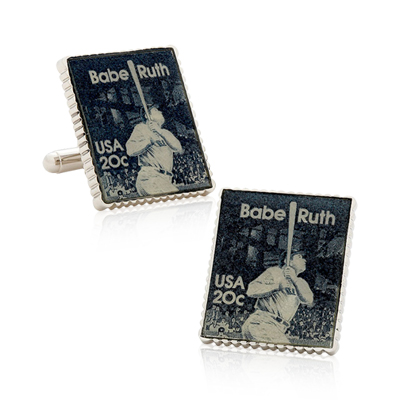 This set of two Babe Ruth baseball cuff links is perfect for the baseball executive in your life. The use of authentic US postage sealed in an epoxy coating combined with beautiful perforated edge setting make these cufflinks a collectors dream. This is every baseball fanatic and every philatelist dream! These Babe Ruth Stamp cufflinks feature the 1983 issue immortalizing the baseball great 35 years after his passing. With its bullet back closure, you are sure to keep your sleeves together as you bring Babe Ruth with you anywhere, and any time in whatever clothes you have on. Complete your professional look and wardrobe with these Babe Ruth Stamp Cufflinks, and be proud of your heritage as an American. Cufflink size: 7/8” x 1”.