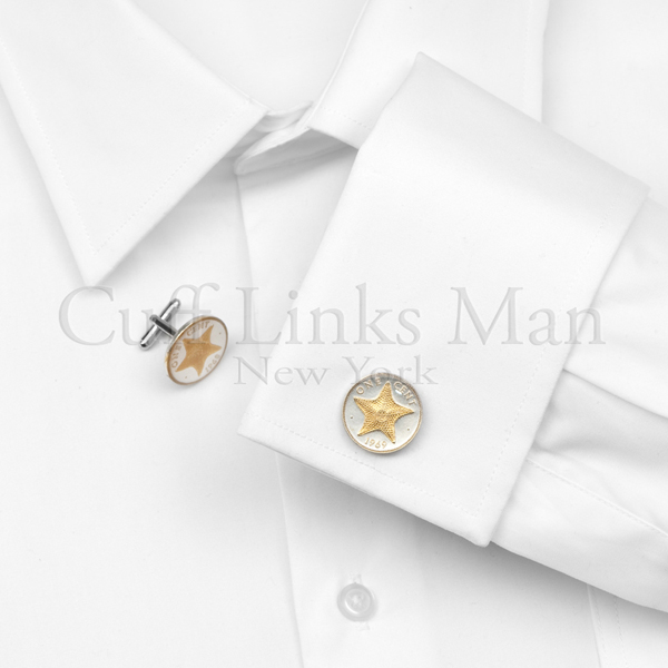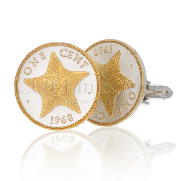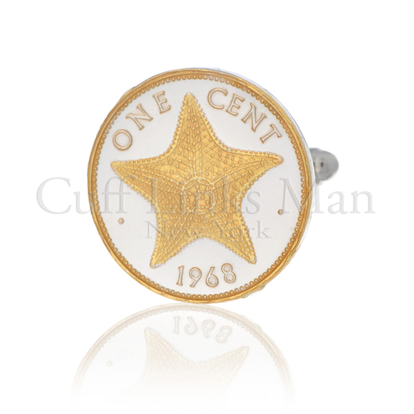 The Bahamas 1-Cent Starfish (Large) Cufflinks is shine just like a shiny coin on the white sands of a beach in the Bahamas. The ornate design of the starfish is eye-catching and absolutely incredible. These Bahamas 1-Cent Starfish (Small) coin cufflinks will look good with any formal ensemble, as well as a casual night out for dinner with that special someone. Don't be afraid to celebrate the starfish and let your hopeless romantic side show. Women love that kind of thing! Wear these Bahamas 1-Cent Starfish (Small) coin cufflinks with pride.