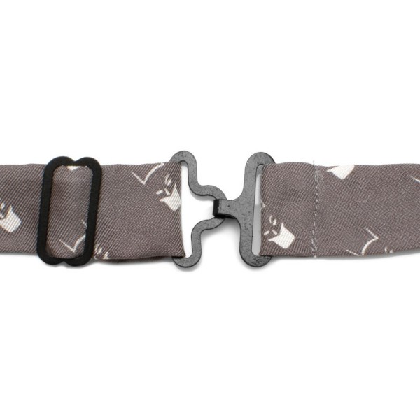 Approximately 4" x 2 3/8". Pre-tied bow with easy-on, easy-off hook closure. 100% Silk. Best suited for ages 6-12.