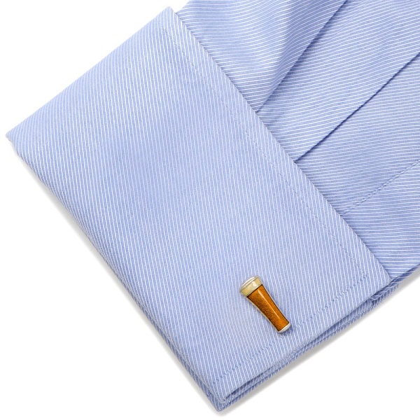 Approximately 1" x 3/8". Plated base metal with enamel. Bullet back closure.