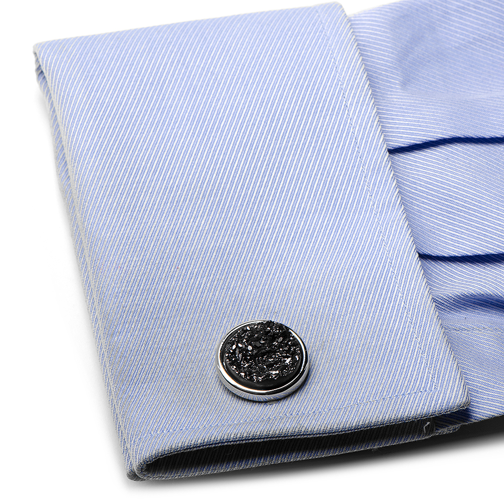 This pair features sparkly black drusy (druzy). Drusy is a gemstone with natural surface texture similar to fine sugar crystals. Drusy is created by the phenomena of micro-crystalline facets forming on a gem and the surrounding rock, they were formed naturally millions of years ago. The cufflinks are push-through style, one solid piece of sterling silver which can be pushed through the cuffs and secured on the under-side.