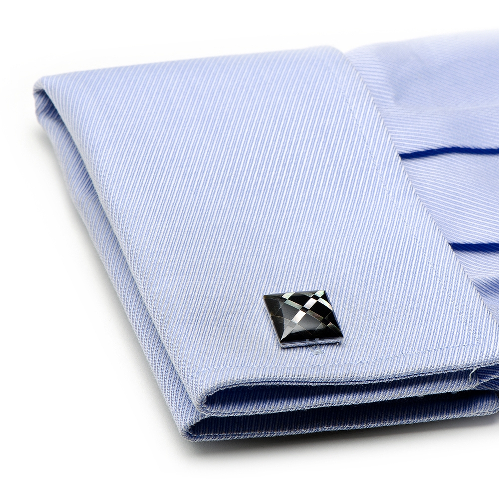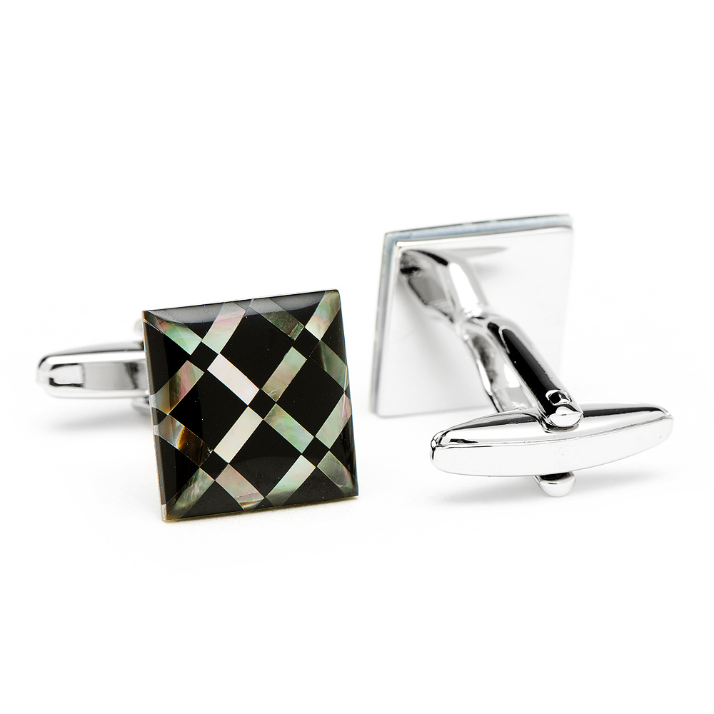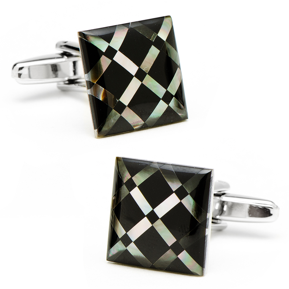 Make a great addition to your wardrobe with these wonderfully constructed black MOP and MOP Diamond Pattern Onyx Cufflinks. Each cufflink measures approximately Approximately 5/8" x 5/8" and are constructed of plated base metal with onyx, and mother of pearl, and have bullet back closures.