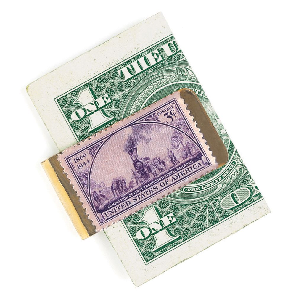 This distinctive gold-plated money clip is accented with an authentic 3-cent U.S. stamp issued in 1944 to honor the 75th anniversary of the Transcontinental Railroad. The historic stamp, over 50 years old, has been carefully sealed to maintain its mint condition. A very special gift with a piece of America's past. Comes with a Certificate of Authenticity.