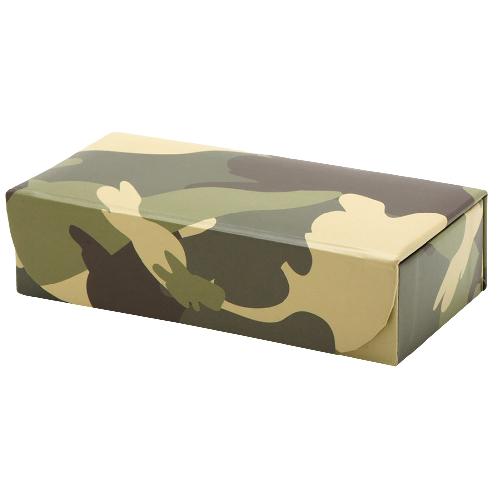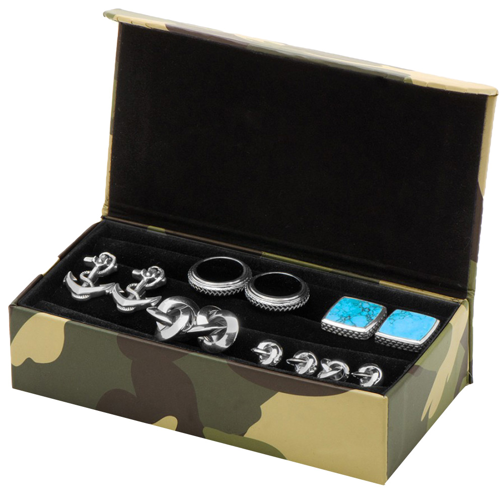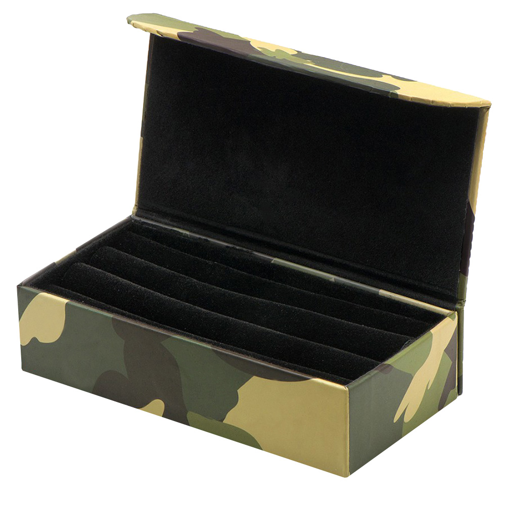 A great way to store and travel with multiple pairs of cufflinks. Camouflage travel case holds up to 6 pairs of cufflinks. Luxuriously lined interior cushions ensure secure transit. Approximately 5"W x 2 1/2"D x 1 1/3"H. Bonded leather with velour interior. 3 rows containing up to 4 pairs in each. Magnetic closure
