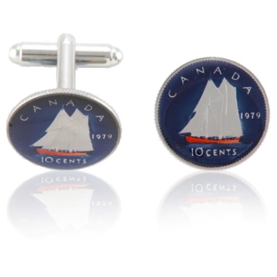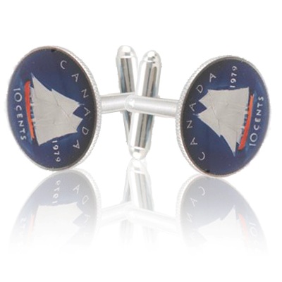 Cufflinks printed with the reverse of a 10 cents canadian coin. This is Hand Painted authentic canadian coins with rhodium plated silver bullet backing. Covered in a blue background is a sailing ship which is engraved in this cufflinks.