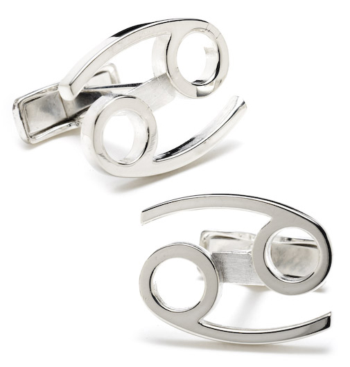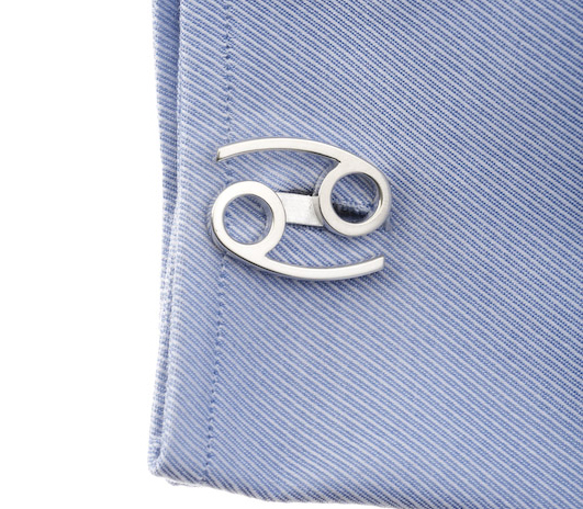 Cufflinks featuring the zodiac symbol from astrology for the Cancer, or crab. The virtues of the Cancer include kindness, emotion, romanticism, and imagination. Cancer is the symbol for birth dates between June 21- July 22.