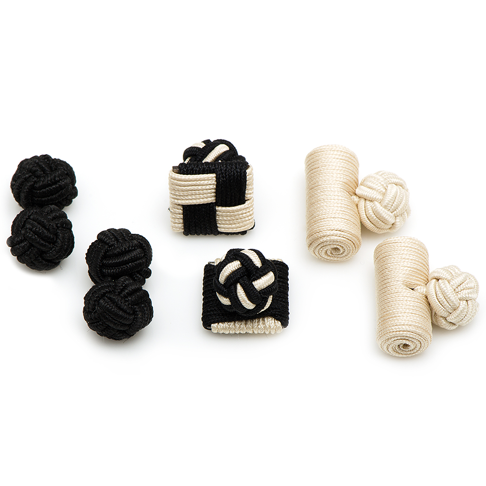Approximately 3/4" by 3/8". Three pairs of assorted silk knots. Packaged in a corked glass vial.