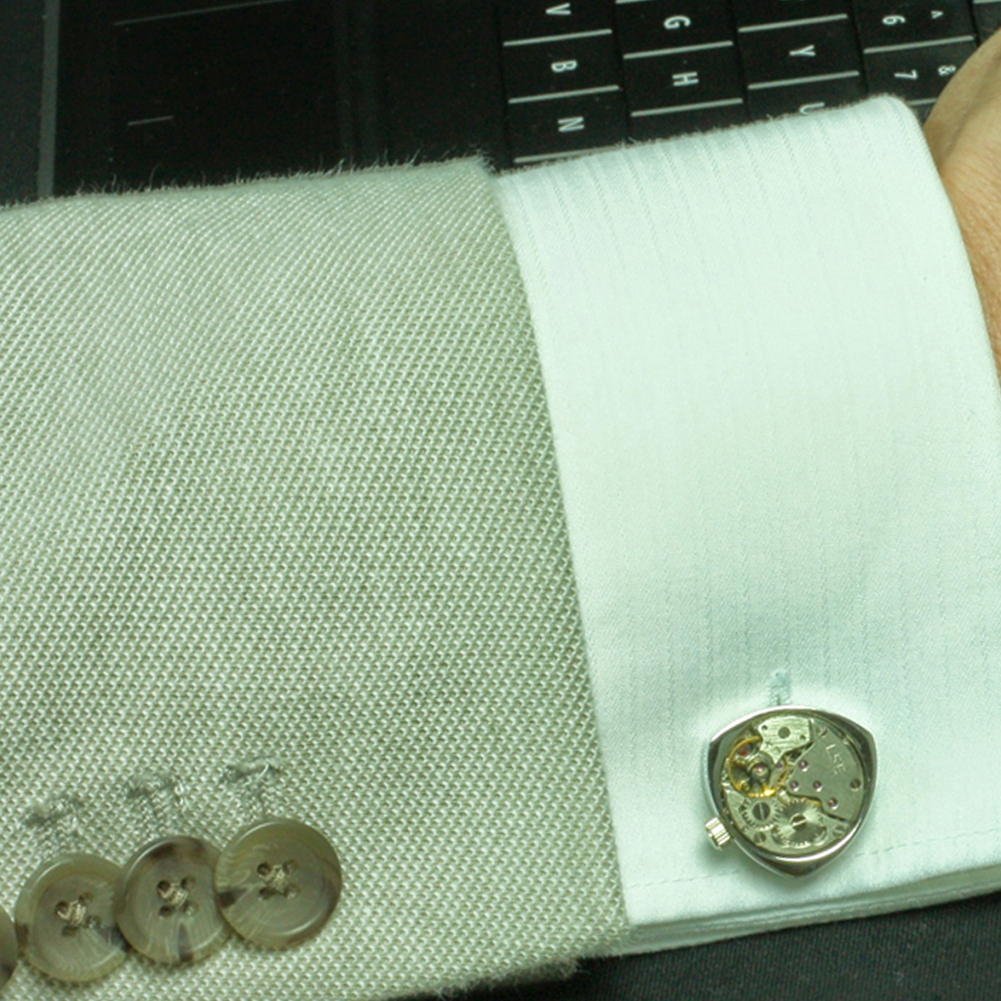 Cufflinksman® presents Watch Movement Cufflinks. Actual mechanism of a watch taken from wind-up watches of the early to mid 20th Century. Featuring inner parts of vintage timepieces, gears, levers and jewels, Cufflinksman Watch cufflinks are approximately 3/4 in diameter. Plated with vintage watch parts and crystal accents. Movement Cufflinks allow you to wear engineering at its finest. Please note that this product is constructed from vintage watch parts and functionality of the watch movements is not guaranteed. Actual watch movements can vary slightly from the pair in the photograph. Watch Movement Cufflinks by Cufflinksman®