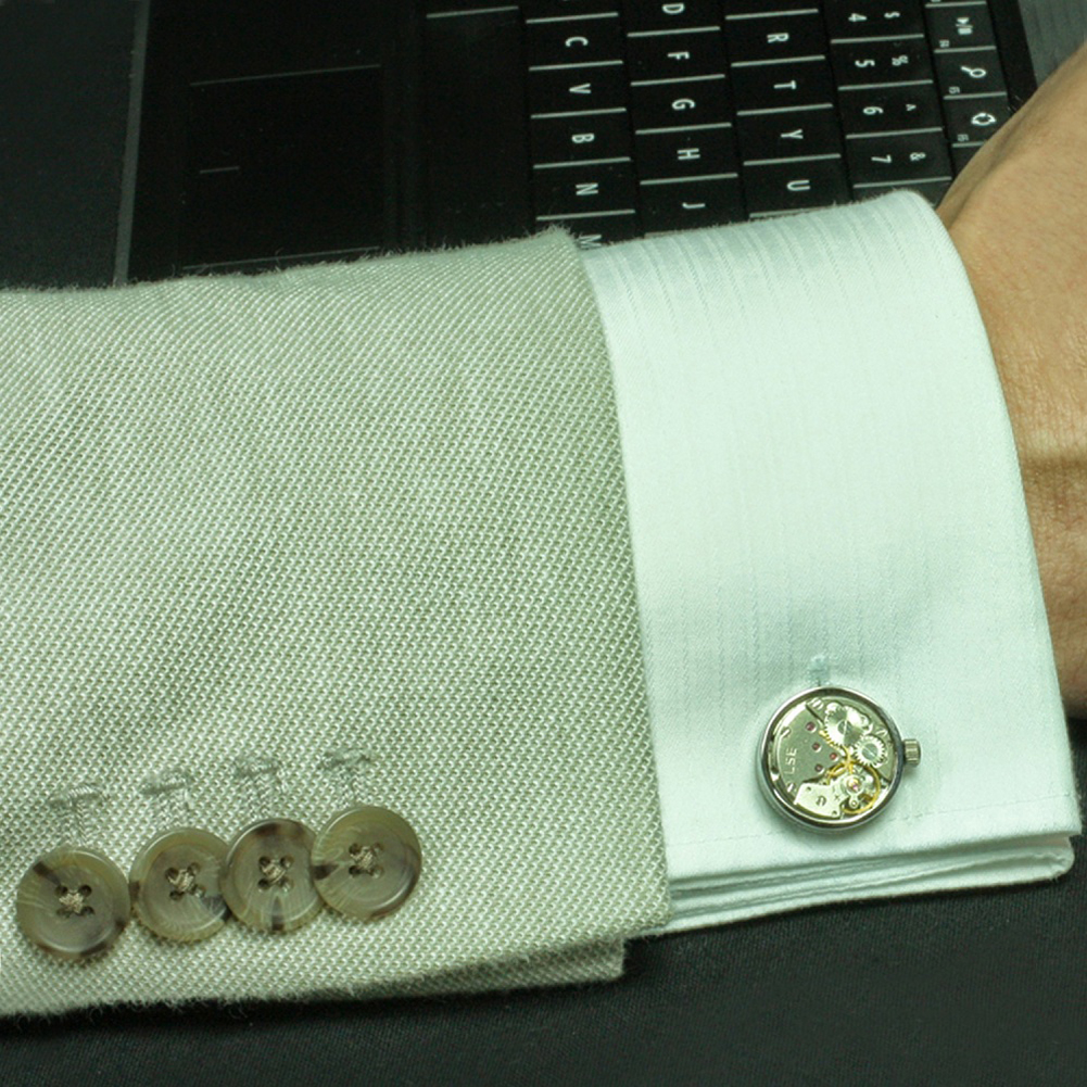 Cufflinksman® presents Watch Movement Cufflinks. Actual mechanism of a watch taken from wind-up watches of the early to mid 20th Century. Featuring inner parts of vintage timepieces, gears, levers and jewels, Cufflinksman Watch cufflinks are approximately 3/4 in diameter. Plated with vintage watch parts and crystal accents. Movement Cufflinks allow you to wear engineering at its finest. Please note that this product is constructed from vintage watch parts and functionality of the watch movements is not guaranteed. Actual watch movements can vary slightly from the pair in the photograph. Watch Movement Cufflinks by Cufflinksman®