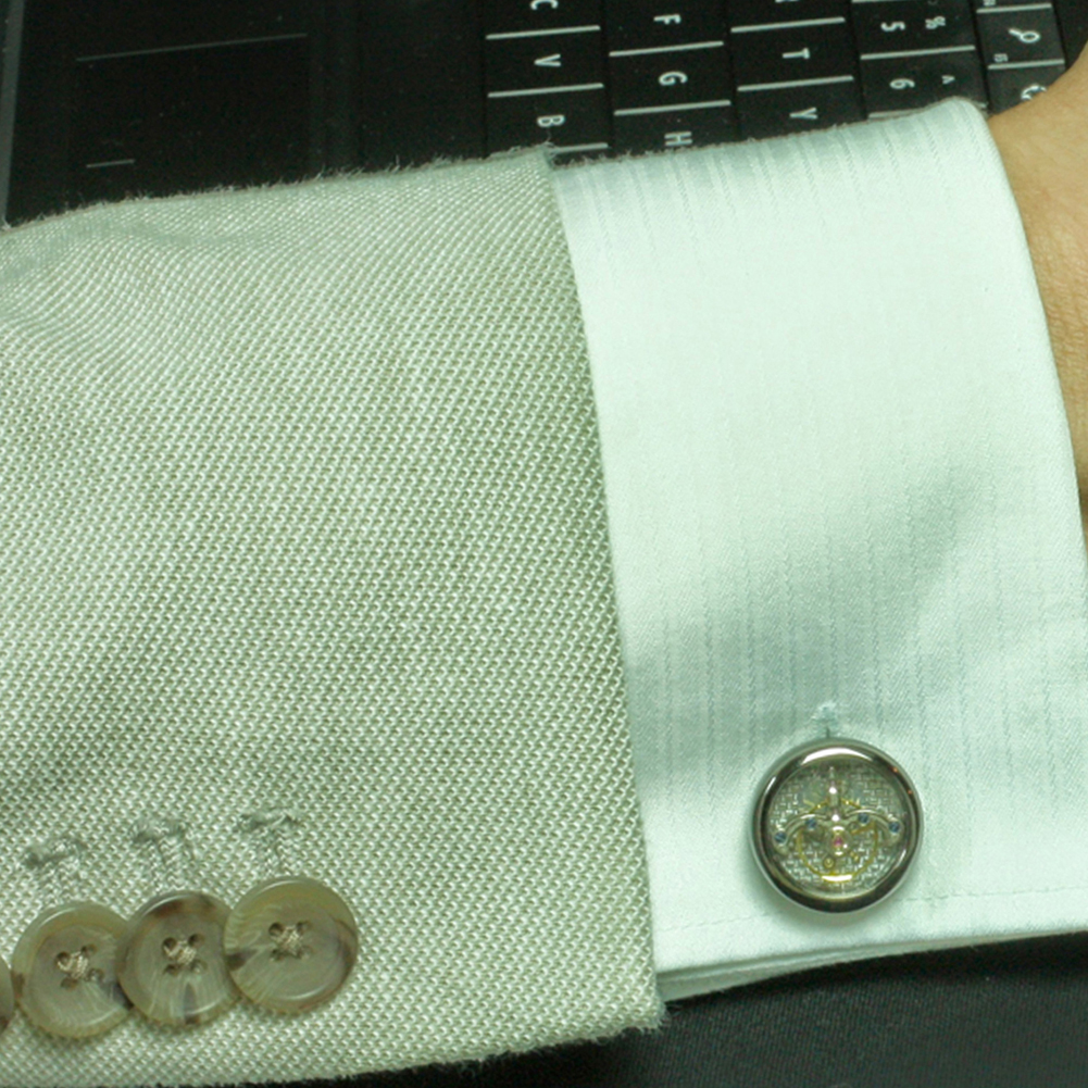 Cufflinksman® presents Watch Movement Cufflinks. Actual mechanism of a watch taken from wind-up watches of the early to mid 20th Century. Featuring inner parts of vintage timepieces, gears, levers and jewels, Cufflinksman Watch cufflinks are approximately 3/4 in diameter. Plated with vintage watch parts and crystal accents. Movement Cufflinks allow you to wear engineering at its finest. Please note that this product is constructed from vintage watch parts and functionality of the watch movements is not guaranteed. Actual watch movements can vary slightly from the pair in the photograph. Watch Movement Cufflinks by Cufflinksman®