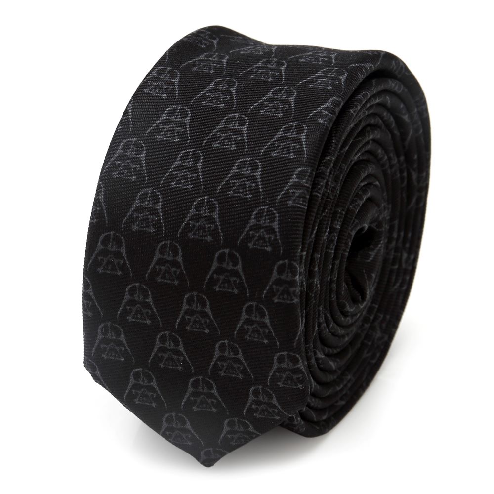 A modern look for the modern Star Wars fan. Only 1.5" wide, this 100% silk skinny tie has rows of Darth Vader helmets marching across the weave in neat rows. Sewn carefully to ensure a smooth knot, this men's skinny black tie also features the Star Wars logo on the reverse.