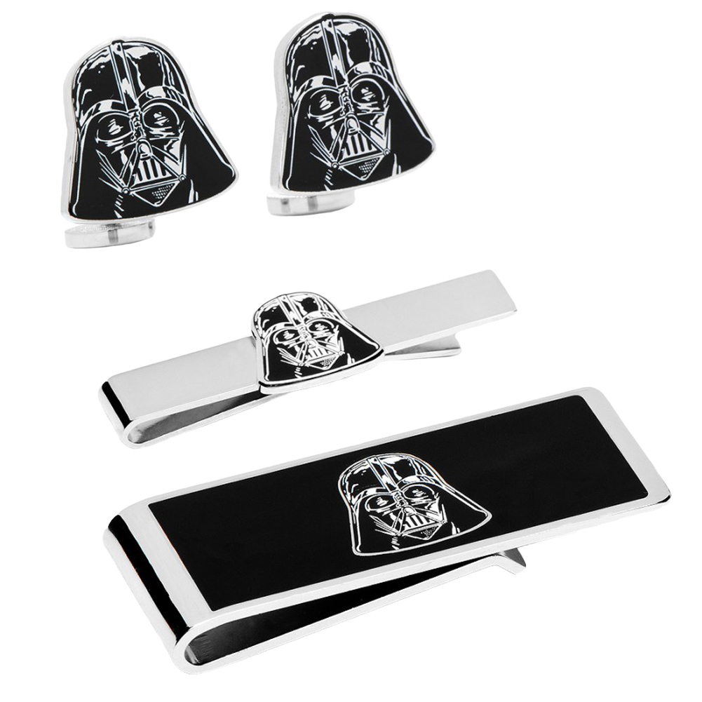 Set includes a pair of officially licensed cufflinks, tie bar and money clip, silver tone and enamel, Officially licensed by Lucas film LTD.