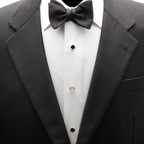 Approximately 3/8" x 3/8". Gold plated base metal with Onyx and Mother of Pearl. Double sided, fixed backing.
