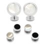 Cufflinks are approximately 3/4" in diameter. Studs are approximately 3/8" in diameter. Plated base metal with Onyx and Mother of Pearl. Cufflinks have fixed backing with stone inlay.