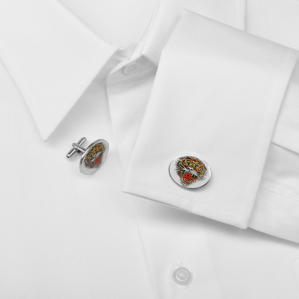 The famous Tiger cufflink on the Prowl Tattoo is beautifully replicated here with these Oval Tiger Cufflinks by Ed Hardy. They feature a silver-tone design and are decorated with a colorful, enamel-finished tiger on the front. It has a Fierce, bold, and unapologetic, these cufflinks are sure to receive some amorous attention. Ed Hardy's designs are inspired by his intense appreciation for the art of tattooing. One cannot deny the stylistic impact of Sailor Jerry either. What we have here are wearable pieces art, which will undoubtedly compliment your savvy artistic personality and show off your love of tattoos. The metal color of the cufflink is white and will come complete with an Ed Hardy signature gift box included in it.