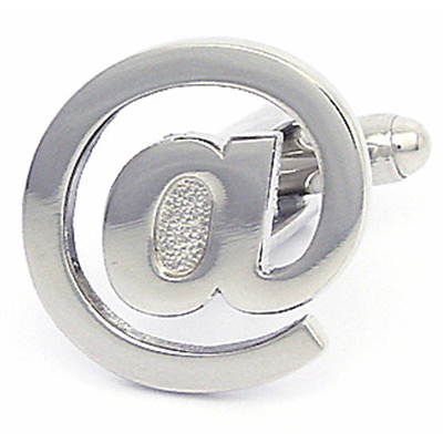 It's “@.” Email Sign Cufflinks It's the most important sign in information age. It's in email and twitter. It's almost everywhere on the internet. It's communication. It is also a pair of cufflinks, made of rhodium plated base metal. Two types are available. One is flat face with black enamel wrapping the silver a in the center, the other with silver hollow frame. Approximately it will measure 3/4 by 3/4 inch.