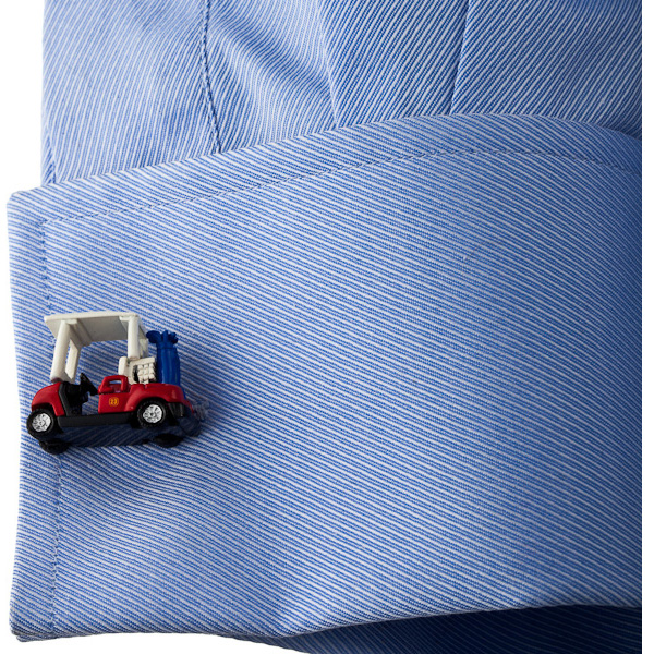 It is an Enamel Golf Cart Cufflinks. During the springtime, one would be hard-pressed to find any of my managers at their desks. Instead, they are usually out on the golf course soaking up the sun over 18 holes. If you have somebody in your life that lives for golf (and let's face it…who doesn't?), then these Golf Cart cufflinks are a must-have! Featuring a shiny red golf cart, complete with two sets of golf clubs in the back, these cufflinks are sure to delight the golfer in your life. Made by Cufflinks, Inc., these cufflinks would make the perfect holiday, anniversary or birthday gift! It will approximately measure 1"L x 3/8"W x 5/8"H in dimension. It has a rhodium plated base metal and enamel and it will come with Bullet back closure.