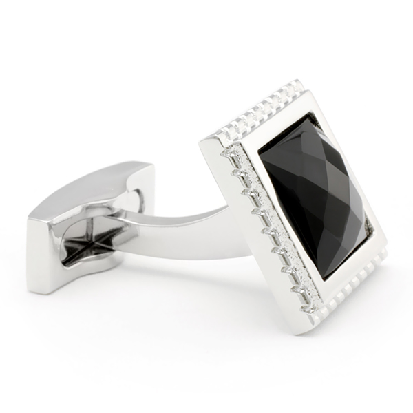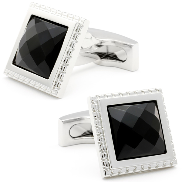True luxury and elegance is defined by the Faceted Onyx Ice Cufflinks. Carefully cut and faceted cubes of rich black onyx are surrounded by high-sheen silvertone setting and fine detailing. The fascinating intricacies of the setting frames the raised stone perfectly- creating a striking and sophisticated cufflink. The delicate bezel gently frames the stone, contributing to the aesthetic appeal, yet also features the revered hardware to support the stone and secure the link to the cuff. If the wearer only owns one pair of cufflinks in a current collection, this is the pair to have. These cufflinks impress without busy baubles.