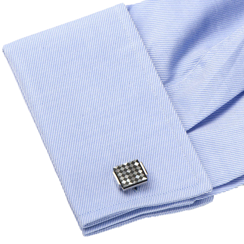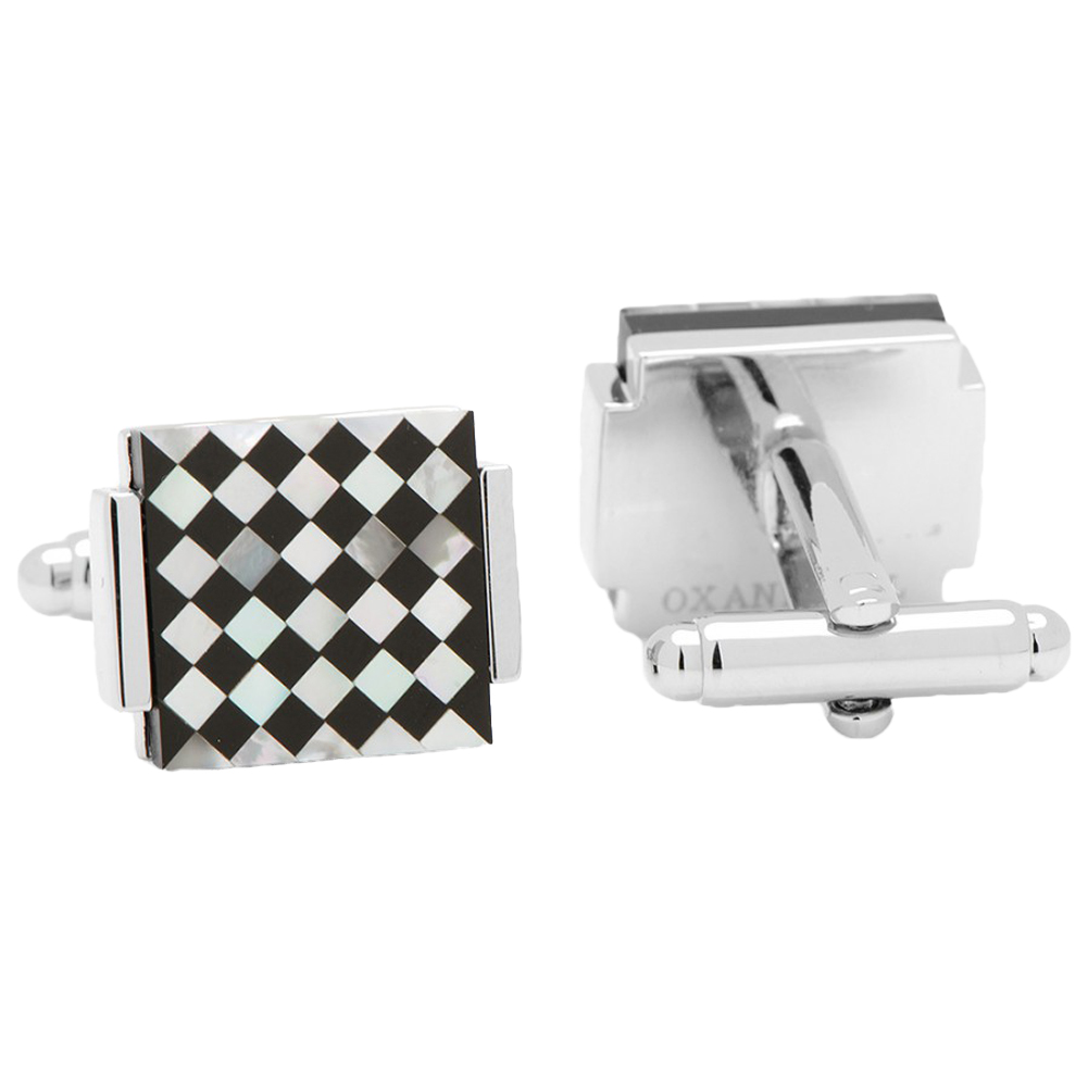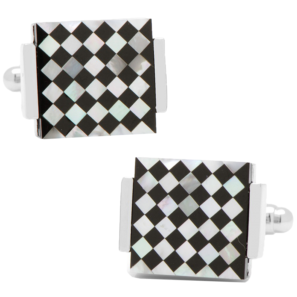 Approximately 3/4" x 3/4", silver tone with lapis and mother of pearl, Bullet back closure.