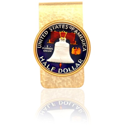 The Declaration of Independence had its bicentennial in 1976—and it's commemorated with this beautiful Two-Tone Bicentennial Half Dollar. Layered with silver and 24k gold, this coin is a great gift for the history buff or collector. he Franklin Half is a coin of the United States which pictured Benjamin Franklin on the obverse and the Liberty Bell on the reverse. A small eagle to the right of the bell is also seen in the coin. This coin design is hand painted in this charming money clip.