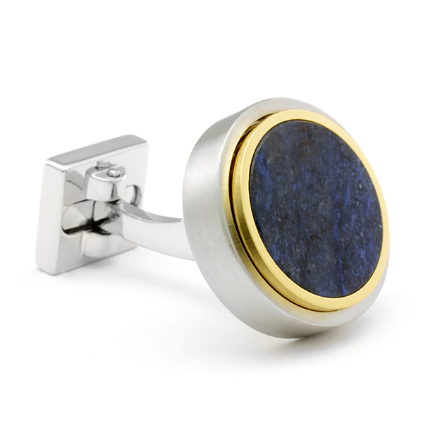 The Galactic Button Cufflinks with Golden Accents on Silver are a pair of fine cufflinks that will stand the test of time; the opulent stone façade resembles a galaxy, aglow with the twinkling flecks of gold, onyx, and silver against a dark blue sky. The golden accents are highlighted by the distinct gold bezel framing each polished stone. The gold detailing then yields to a generous setting of burnished silver, extending to the back and closure of each cufflink. The result is futuristic, modern, and unique- making this an ideal addition to even the most expansive jewelry collection.
