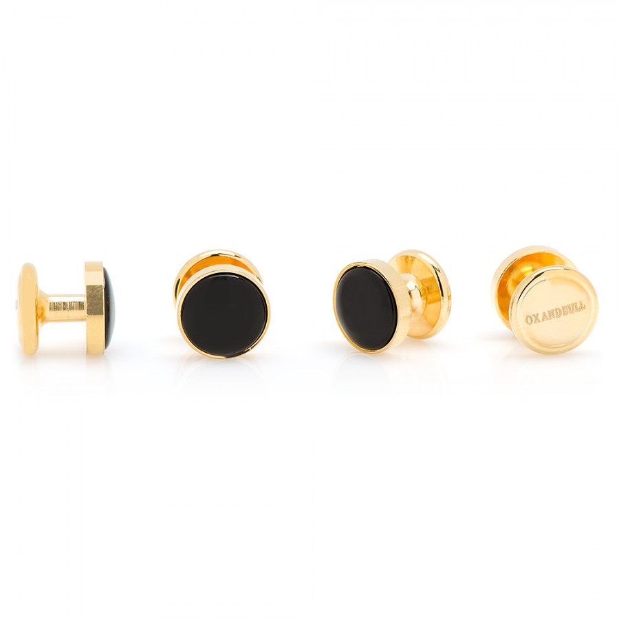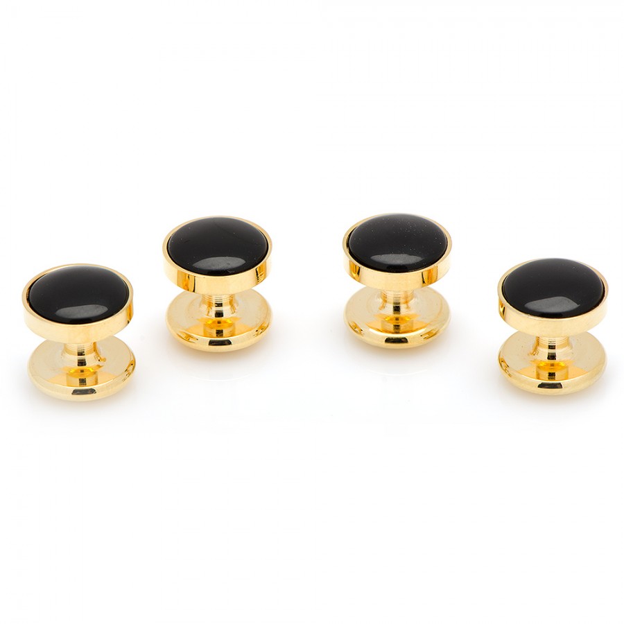 These Gold and Onyx Studs is a elegant accents for the well-dressed man. Complete with four studs and two cuff links. Genuine onyx and gold-plated. These stud earrings feature two 5mm square-cut black onyx gemstones. The total gem weight for the earrings is 1.8 carats, set in solid 14k gold. Each earring is 3/16 of an inch from top to bottom and is 3/16 of an inch wide from side to side.