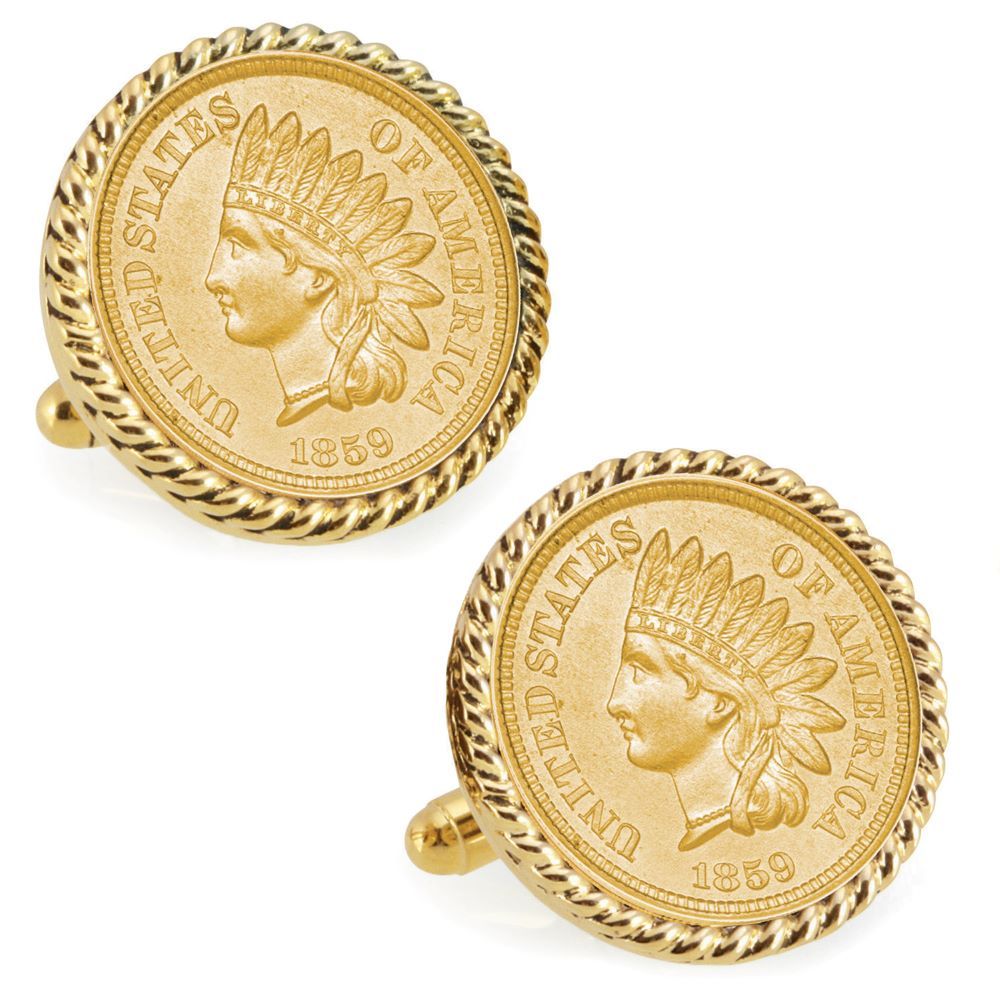 Gold-Layered 1859 First-Year-of-Issue Indian Head Penny Goldtone Rope Bezel Coin Cufflinks
