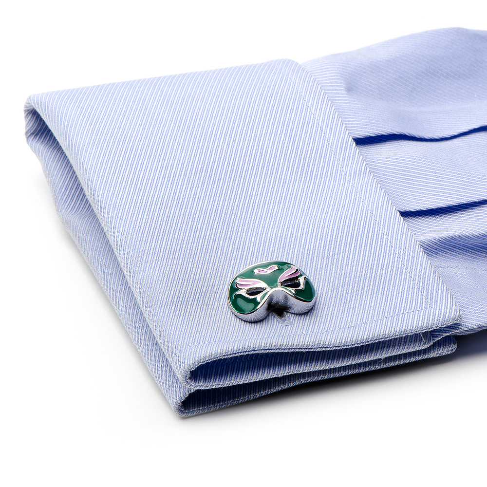 Green & Purple Mardi Gras Venetian Mask Cufflinks Make a great addition to your wardrobe. Each cufflink measures Approximately 3/4" X 1/2" are enamel and plated base metel and have bullet back closures. Design by CufflinksInc.