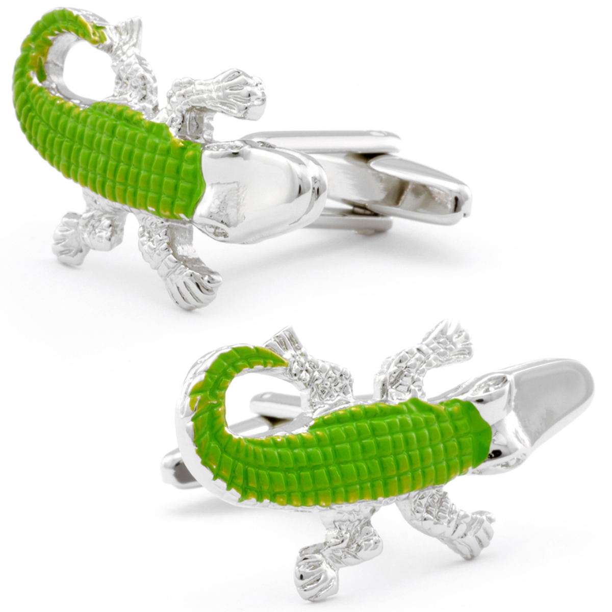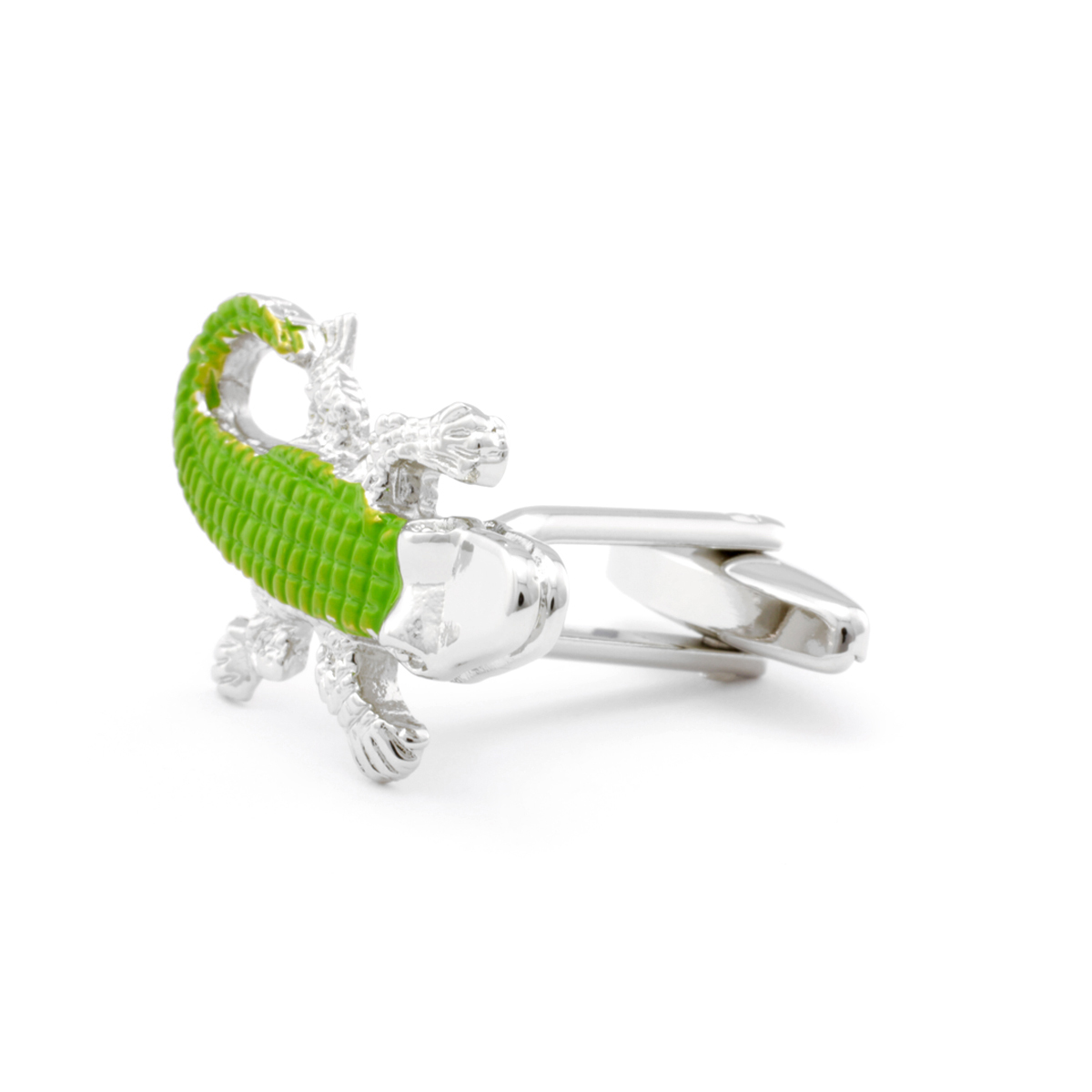 Green Gator Alligator Cufflinks with silver body has a aquatic green enamel painting down the back and curved tail, silver hear and legs. Links are set in a Rhodium bullet back setting.