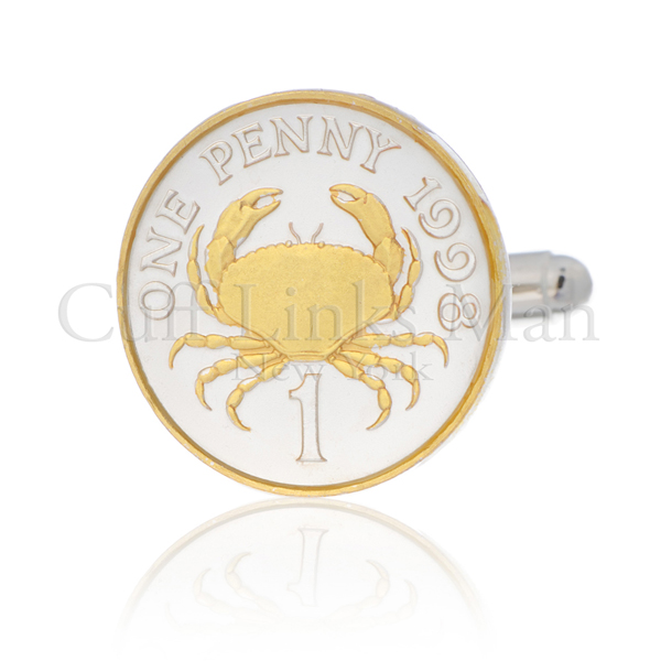 This coin is a nickel size. Each one of these real coins from around the world is first layered in pure bright silver. Then, by hand, the figures of each are highlighted and brought to life with rich, pure 24KT gold. This breathtaking work, done exclusively by J & J Jewelers, turns these coins into stunning and true works of art. The design and detail of the crab is exquisite, and a touch of 24-karat gold was added to transform these coins into a beautiful two-tone collector’s item. You may not know where Guernsey is, or are even interested in crab, but you will appreciate the timeless beauty of these Guernsey Penny Crab coin cufflinks. Add something unique and special to your cufflink collection. You won’t be disappointed. Presentation box included.