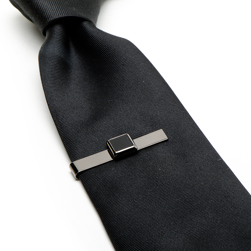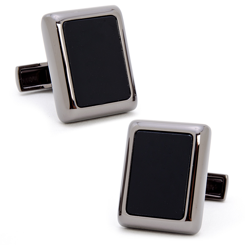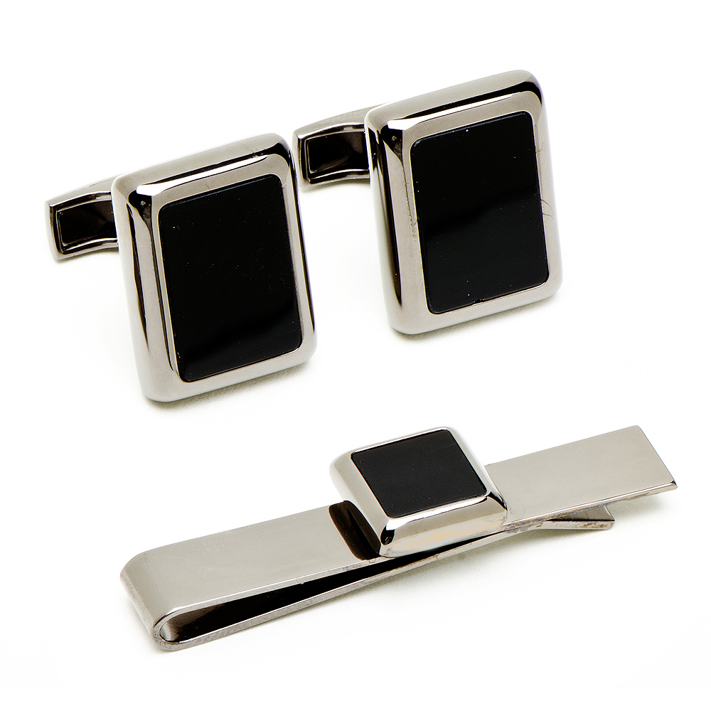 Gift Set includes 1 tie bar and 1 pair of cufflinks. Tie bar approximately 1 7/8" x 1/4", cufflinks approximately 7/8" x 5/8" in size. Sliding tie bar, cufflinks feature engravable whale backing with Gunmetal plating and onyx.