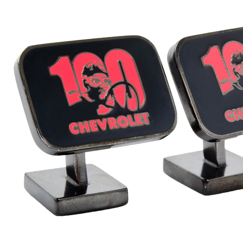 Commemorating 100 years of automotive excellence, Gunmetal Chevrolet Centennial Cufflinks are painted with "Carbon Flash" black enamel and feature a fixed back closure showcasing the GM logo. A tribute to race car driver turned entrepreneur Louis Chevrolet is captured in bold race ready red enamel. Perfect for the life-long Chevy Fan, pick up a pair before 3PM Central and enjoy same day shipping! Officially licensed by General Motors. Approximately 3/4" x 1/2". base metal, gunmetal finish and enamel. Officially Licensed By General Motors