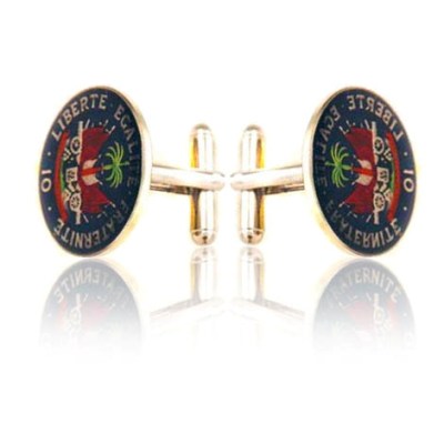 The coat of arms of Haiti is shown in the 10 centimes coin. The coat of arms depicts draped flags, which are located before a palm tree and cannons on a green lawn. Above the palm tree, there is a Phrygian cap placed as a symbol of freedom. Go for these unique hand printed cufflinks which symbolizes freedom. This will add an air of sophistication to your formal outfit.