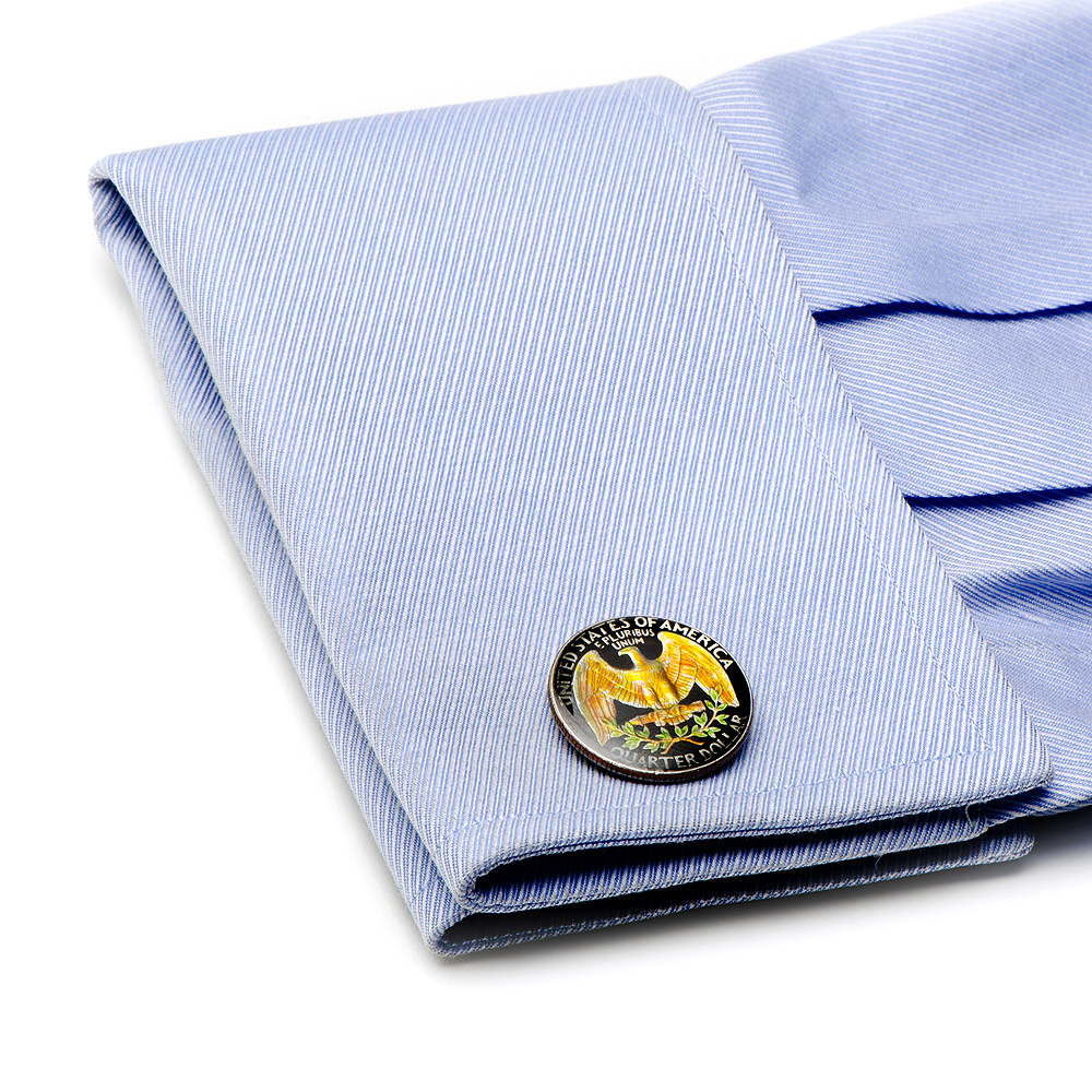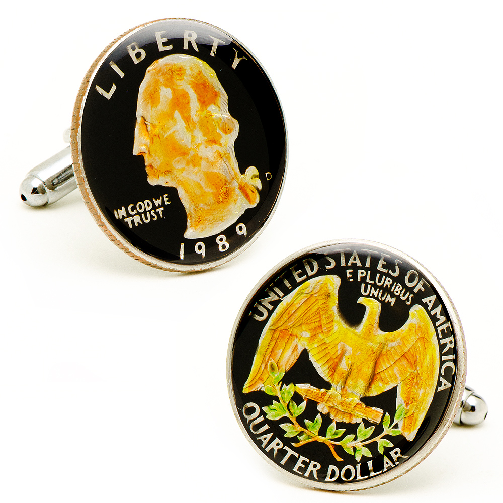 Approximately 7/8" in diameter Silver plated finding with authentic US Quarter and enamel Bullet back closure.
