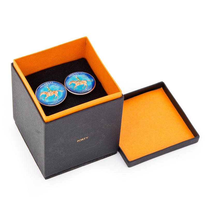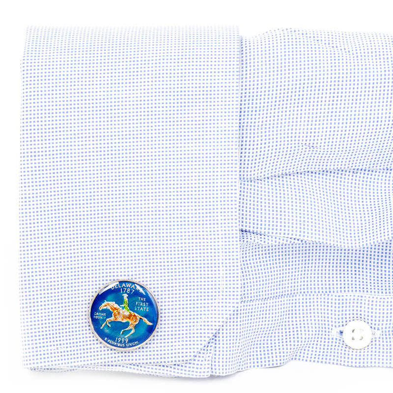 These amusingly crafted Delaware cufflinks portray the patriot Caesar Rodney on his well-known midnight ride to gather the votes indispensable to make certain Delaware could be confirmed sovereign from British rule. If you have love for "The First State," these cufflinks are the wonderful addition to your collection. Each pair was hand painted with bright enamels to pay respect. Cufflinks by Penny Black 40.