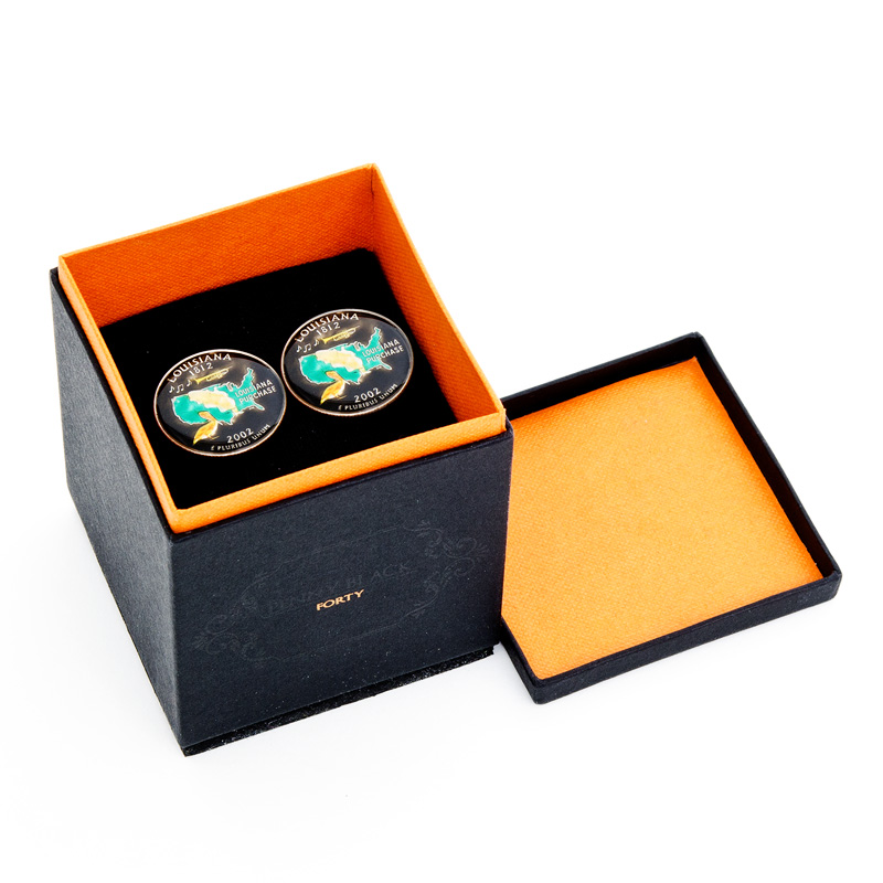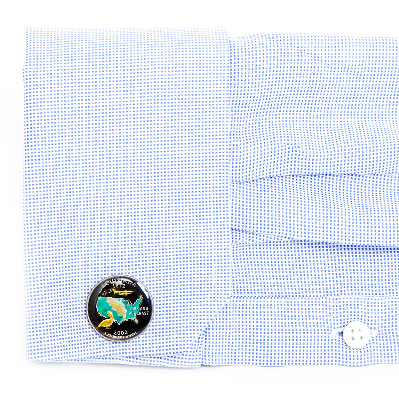 Authentic US Mint state quarters have been hand painted to highlight the treasures of each state depicted. hand painted to perfection. Hand Painted Coin Cufflinks are covered in a protective epoxy coating and placed on a rhodium plated cufflink. Hand Painted Louisiana State Quarter Cufflinks , approximately 1" in diameter , Rhodium Plated with Silver Bullet Backing. Design by Penny Black 40.