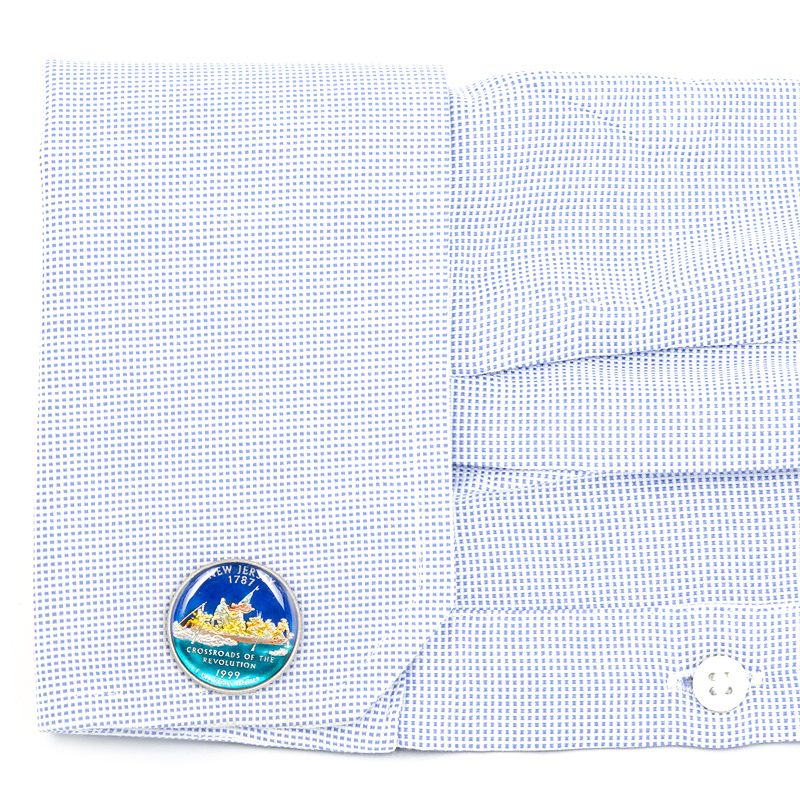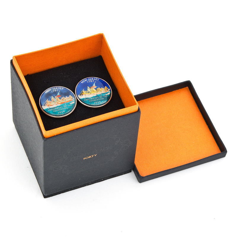 This Hand Painted New Jersey State Quarter Cufflinks is hand Painted Coin Cufflinks are covered in a protective epoxy coating and placed on a rhodium plated cufflink. Packaged so nicely, all you need to add is a bow. This Hand Painted New Jersey State Quarter cufflinks are approximately 1" in diameter, Rhodium Plated with Silver Bullet Backing. Design by Penny Black 40.