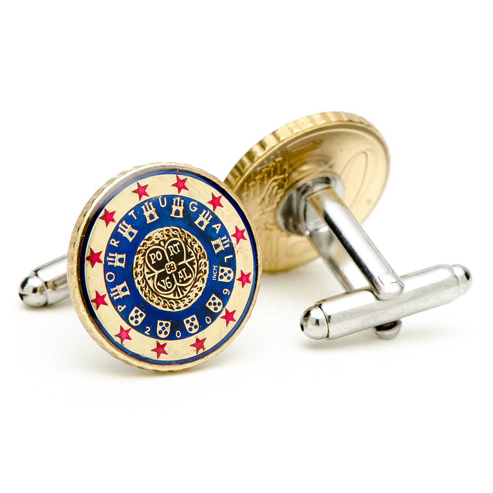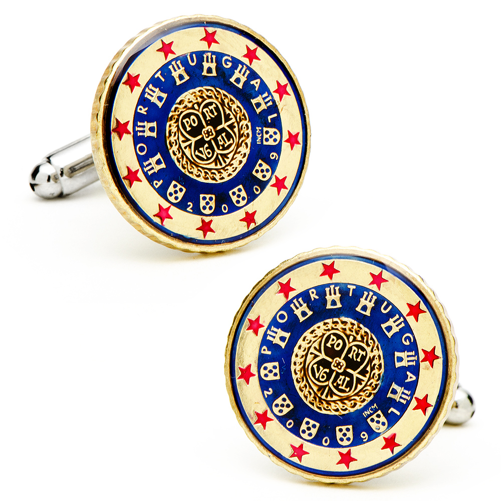 Each Coin cufflink is hand painted and unique. The Hand Painted Portugal Coin Cufflinks feature an authentic Portuguese coin with enamel. Approximately 3/4" in diameter. Cufflinks by Penny Black 40.
