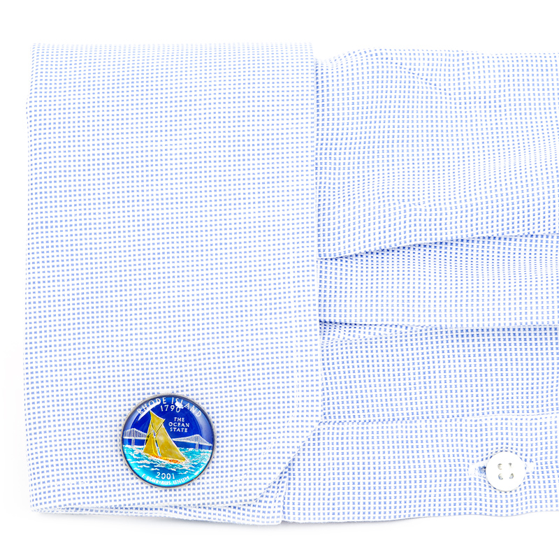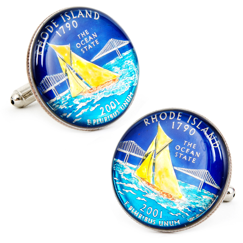 This Hand Painted Rhode Island State Quarter Cufflinks is of Rhode Island is only 37 miles wide and 48 miles long. This was the first state to forbid slavery by law and they had the first Baptist church and synagogue in the US. This Hand Painted Rhode Island State Quarter cuff links are approximately 1" in diameter, Rhodium Plated with Silver Bullet Backing. Design by Penny Black 40.