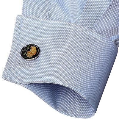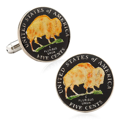 These beautiful Hand Painted USA Buffalo Nickel Coin Cufflinks feature a gold buffalo against a striking dark background. - Approximately 3/4" in diameter - Hand Painted Authentic USA Coins - Rhodium Plated Silver Bullet Backing.