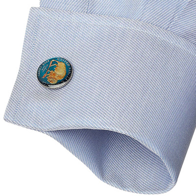 For the man seeking to make a truly distinctive statement. These Robert Graham cuff links feature genuine buffalo nickels and signature paisley backs. The nickels are hand-painted, making each cuff link a unique work of wearable art. These rare U.S. Coin Cufflinks feature both sides of the nickel coin vibrantly painted in blues, oranges, yellows, and golds. - Approximately 5/8" in diameter - Hand Painted Authentic USA Quarter - Rhodium Plated Silver Bullet Back.