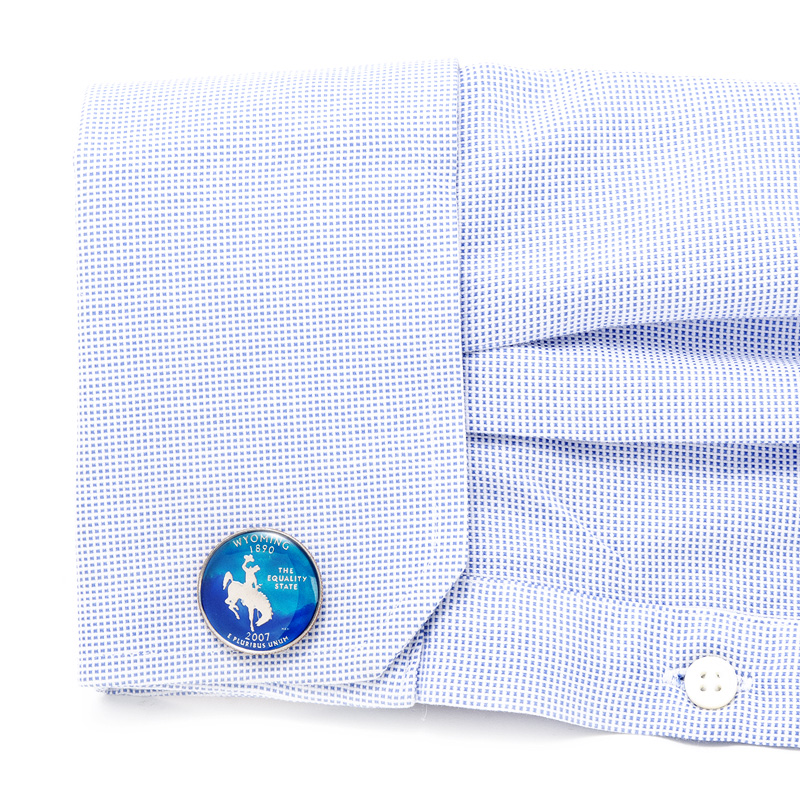 Celebrate Wyoming's historical forward-thinking with these beautiful Hand Painted Wyoming State Quarter Cufflinks. They feature the outline of a cowboy on a bucking horse and are inscribed with "The Equality State." Constucted with Rhodium Plated Silver Bullet Backing with Approximately 1" In Diameter.