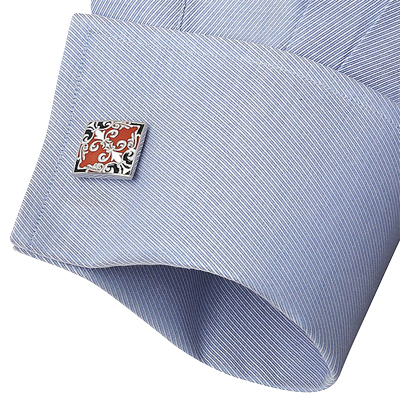 These cufflinks are designed by L2 and are made from silver plating. Red, black, and ivory enamels have been used to create this intricate design with the silver plating providing the shiny effect. The artistry of this design skillfully plays with the silhouettes and shapes of this signature piece featuring traditional black enamel accents. The result is a pronounced pair of cufflinks that is significantly conspicuous wherever you may go