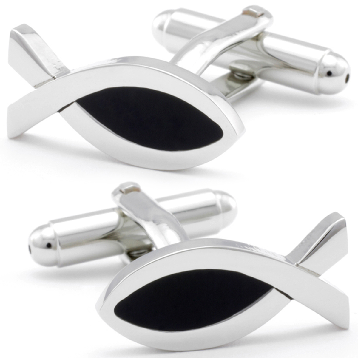 The symbol of the fish gained a meaning of high significance for early Christians, and is still recognized as a Christian symbol today. The fish is a logical symbol for the early Christian church to adopt as not only was fish a common food of the day, it was also used by Jesus during His ministry. This pair of cufflinks features the ichthus christian fish in black enamel surrounded by arcs of silver.