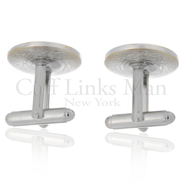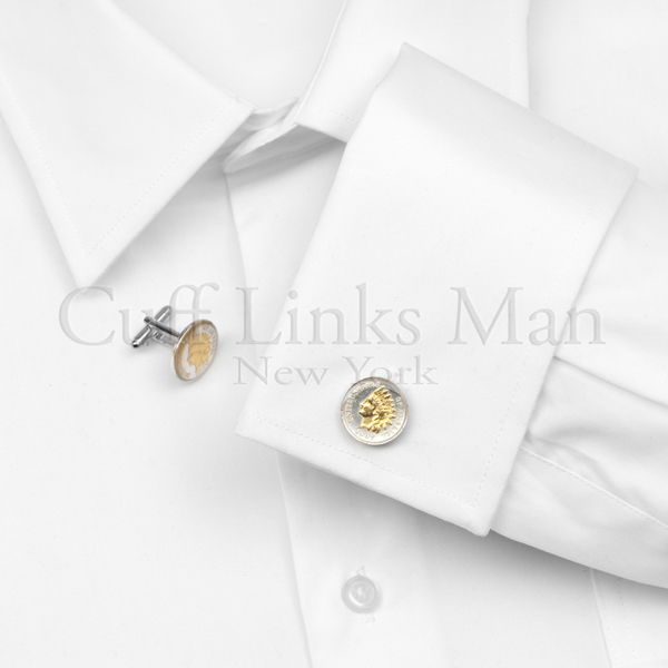 Indian Head Penny coin cufflinks with sterling silver fittings. The Indian Head Penny was produced between 1859 and 1909 and minted in Philadelphia and latterly San Francisco. The mint mark is below the wreath on the reverse side of the coin. It is a high quality indian head pennies ranging in date from 1859-1909 are skillfully set in a genuine 925 sterling silver setting. These distinguished cufflinks feature a genuine Indian Head Penny surrounded in gold-plated trim. These Indian Head Penny coin cufflinks are absolutely incredible. Each cufflink was handcrafted from pure silver and delicately brushed with 24-karat gold. The two-tone look brings each coin to life, while simultaneously preserving the intricate design. Additionally, each Indian Head Penny coin cufflink was polished for an immaculate shine, and finished with a smooth protective coating. Add a pair of Indian Head Penny coin cufflinks to your cufflink collection and pay tribute to a great piece of American history.